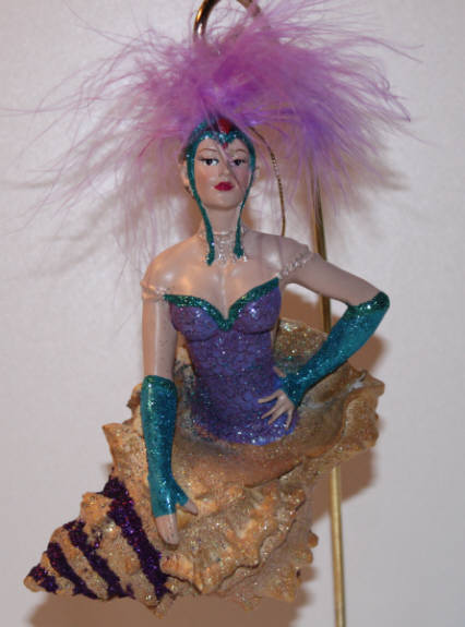I love this mermaid. Shelly coming out of her conch shell with those long blue arm gloves and pink feathered hair looking fresh and stunning. She gets a nice spot in my display cabinet with the other feathered mermaids.