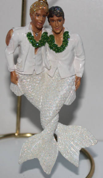 This ornament was smaller than I thought. In fact, tiny in comparison to all of my mermen. This was bought as a Christmas present to us on our first Christmas as a married couple. I thought the two grooms were enough from 2009, but these grooms fit in nicely between the 2009 grooms in my curio. They look nice.